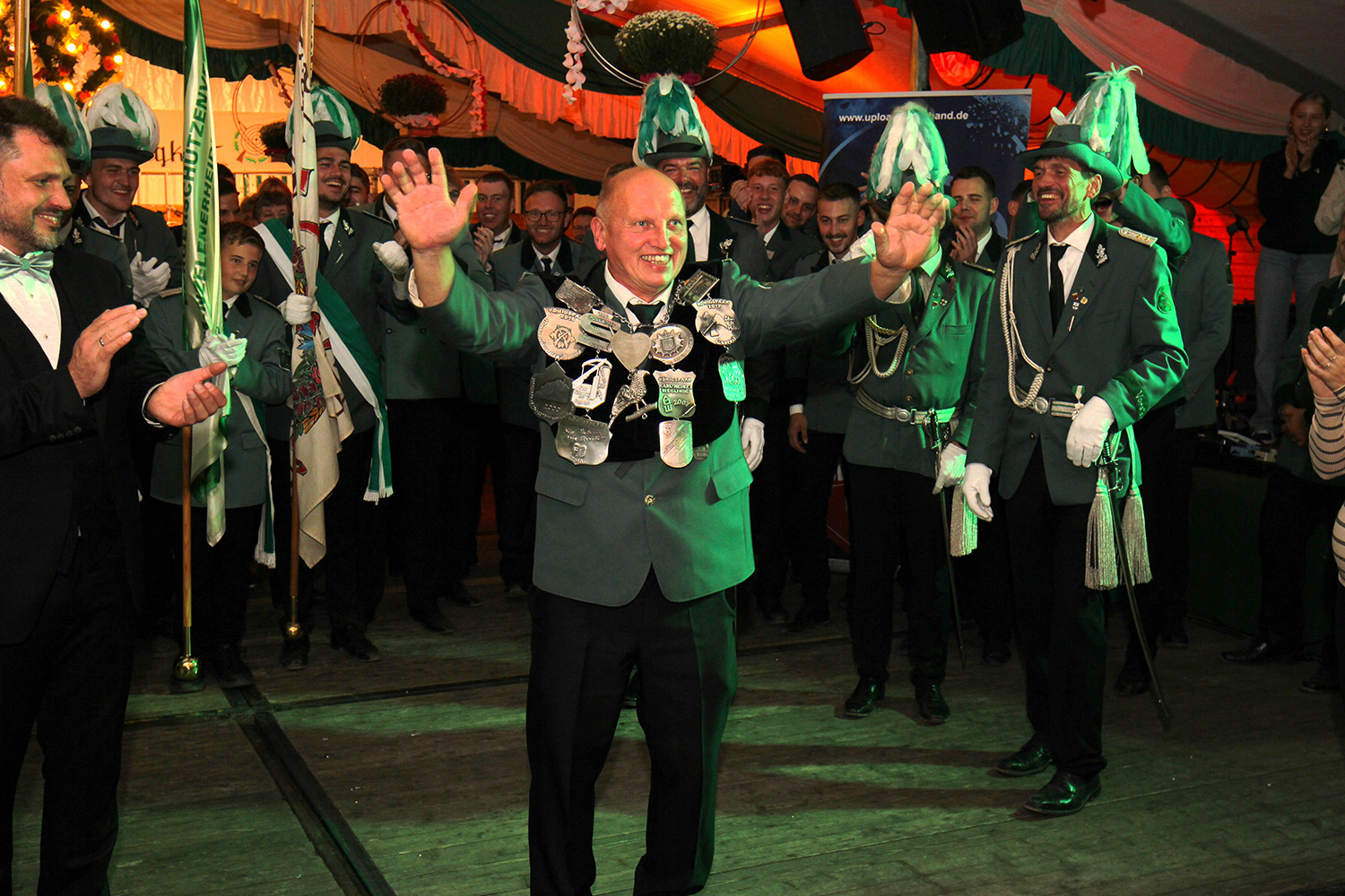 Im Anschluss spielte die Band UPLOAD für alle Anwesenden zum Tanz auf. Gegen 20.00 Uhr begrüßte der Bürgerschützenverein die Abordnungen der geladenen und befreundeten Bruderschaften aus Menzelen-Ost und Bönning-Rill. Im Rahmen des Krönungsballes nahm der Präsident Karsten Scholz die Jubilarehrungen vor. Im Anschluss erhielten die erfolgreichen Schützen ihre Preise. Insgesamt waren beim Preisschießen am Sonntag und am Montag über 50 Schützen treffsicher und konnten hierfür dank zahlreicher Spender und Gönner des Vereins ansehnliche Preise in Empfang nehmen. Es schloss sich ein geselliger Abend mit toller Stimmung im Festzelt an.