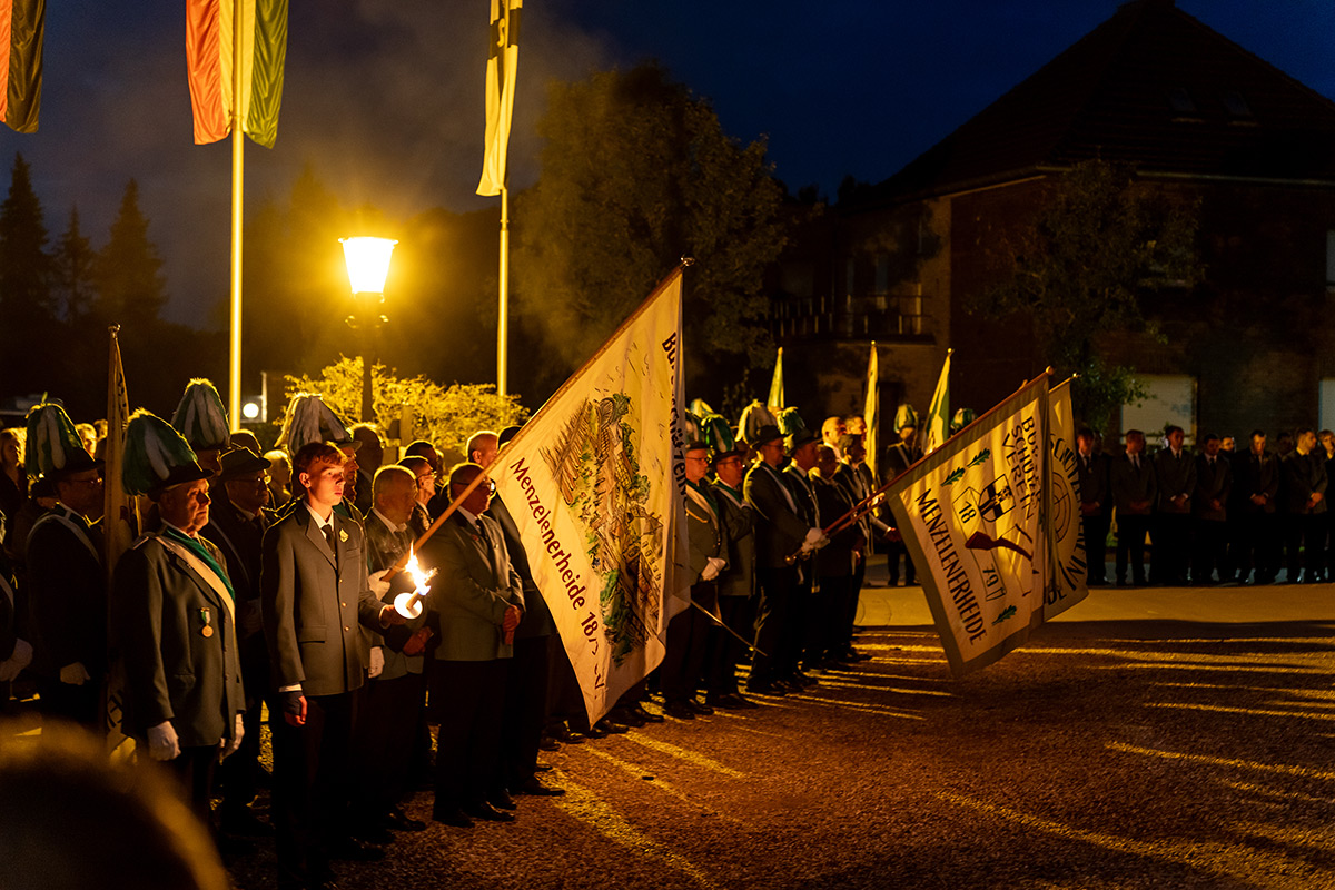 Um 19.45 Uhr zogen die Schützen in einem Fackelzug auf den Schützenplatz „Am Wippött“. Hier erfolgte durch den Präsidenten Karsten Scholz die Kranzniederlegung. Begleitet wurde die Kranzniederlegung wieder von einer Abordnung der Reservisten der Bundeswehr, die während der Zeremonie auch eine Ehrenwache am Ehrenmal stellten.