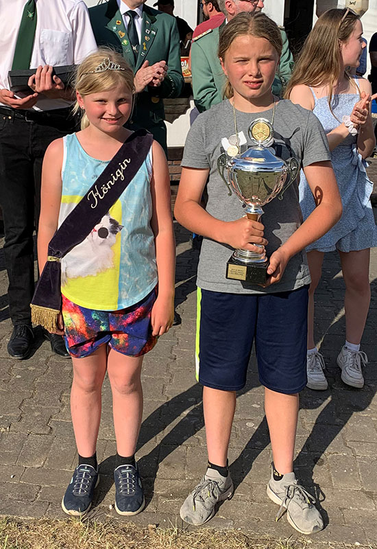 Anschließend traten die Bürgerschützen an und Lasse wurde von der Königin des Bürgerschützenvereins Menzelenerheide, Kirsten Jakubowski, durch Übergabe des Königssilbers in sein Amt eingeführt. Lasse wählte seine Schwester Clara Rösken zur Königin. Gleichzeitig wurde der bisherige Kinderschützenkönig Lasse Plegge, der dieses Amt drei Jahre innehatte, verabschiedet. Der neue Kinderthron von König Lasse Rösken und Königin Clara Rösken setzt sich wie folgt zusammen: