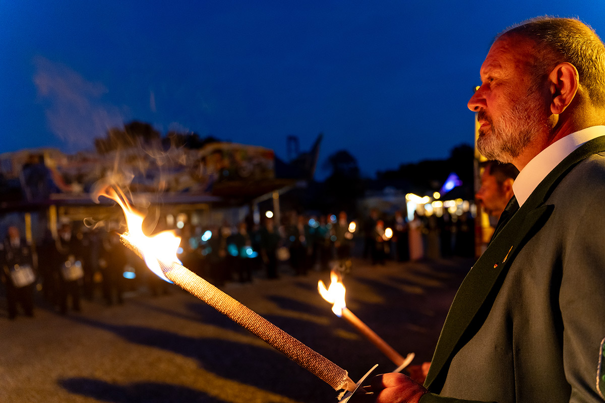 Um 19.45 Uhr zogen die Schützen in einem Fackelzug auf den Schützenplatz „Am Wippött“. Hier erfolgte durch den Präsidenten Karsten Scholz die Kranzniederlegung. Begleitet wurde die Kranzniederlegung wieder von einer Abordnung der Reservisten der Bundeswehr, die während der Zeremonie auch eine Ehrenwache am Ehrenmal stellten.